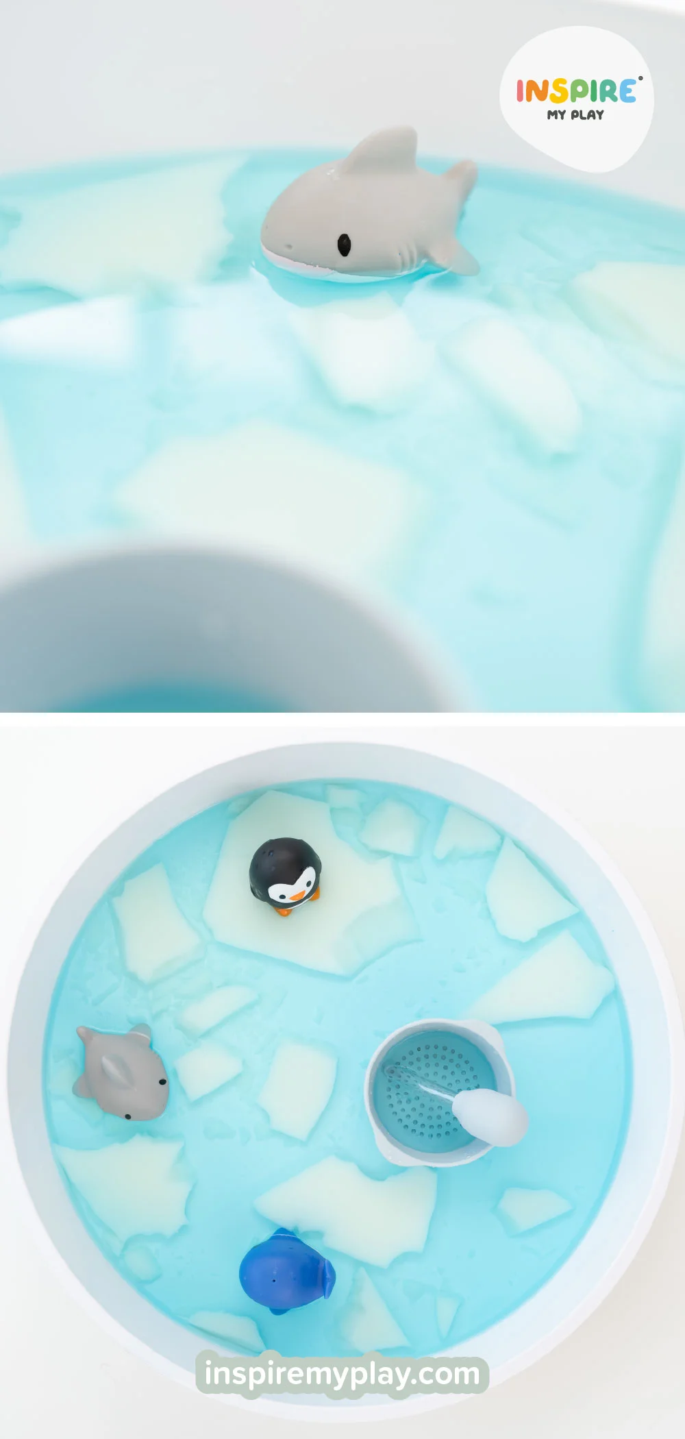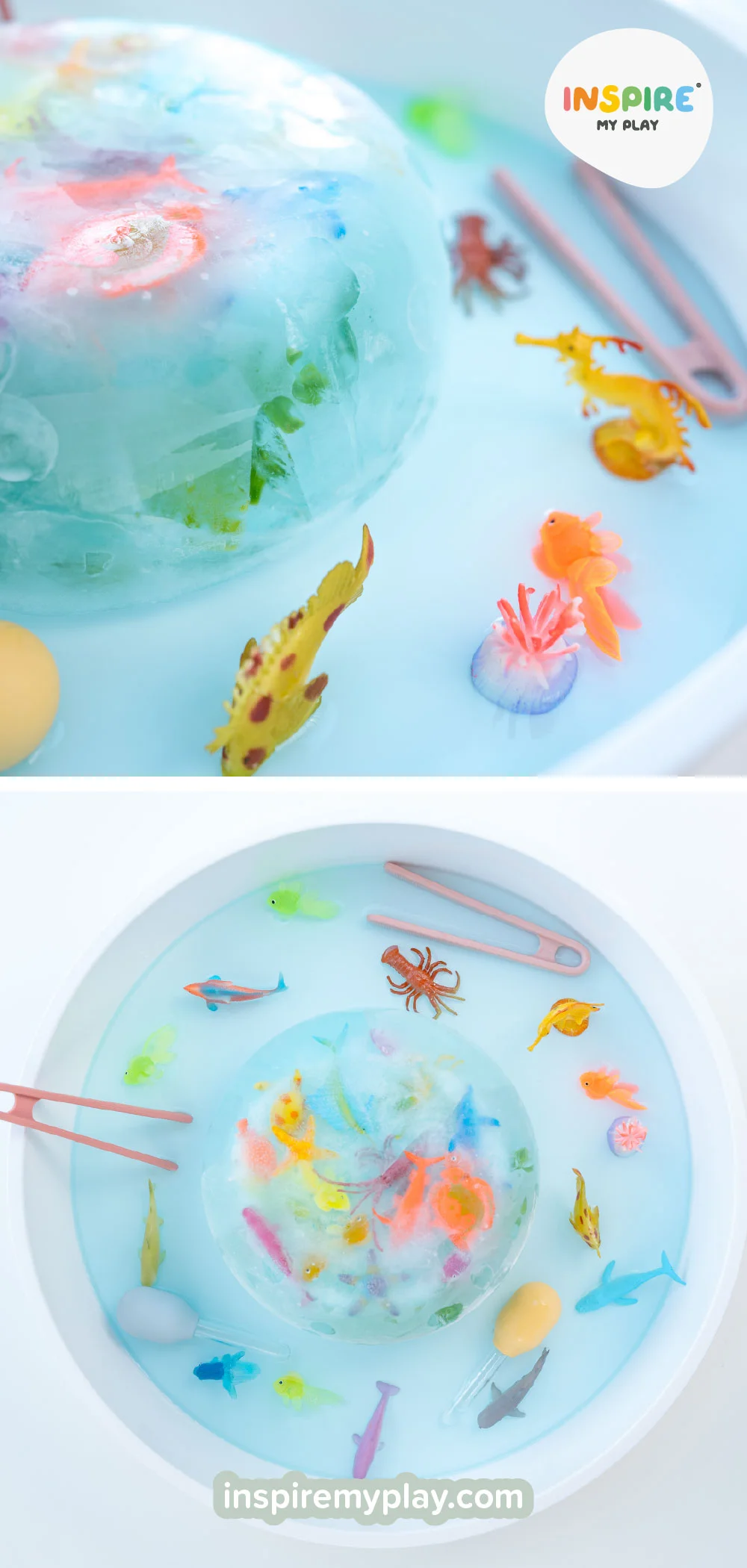 Freezing water is also a great option. We created a frozen ocean small world, this activity is great for developing fine motor skills. Use our tongs to rescue the animals!