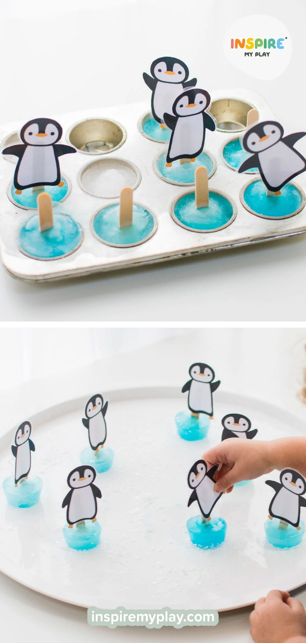 Or make an ice rink for penguins (like we did in the image below)! You can download the penguin cutouts on our FREE Printable Resources page (just search Penguin Ice Rink).