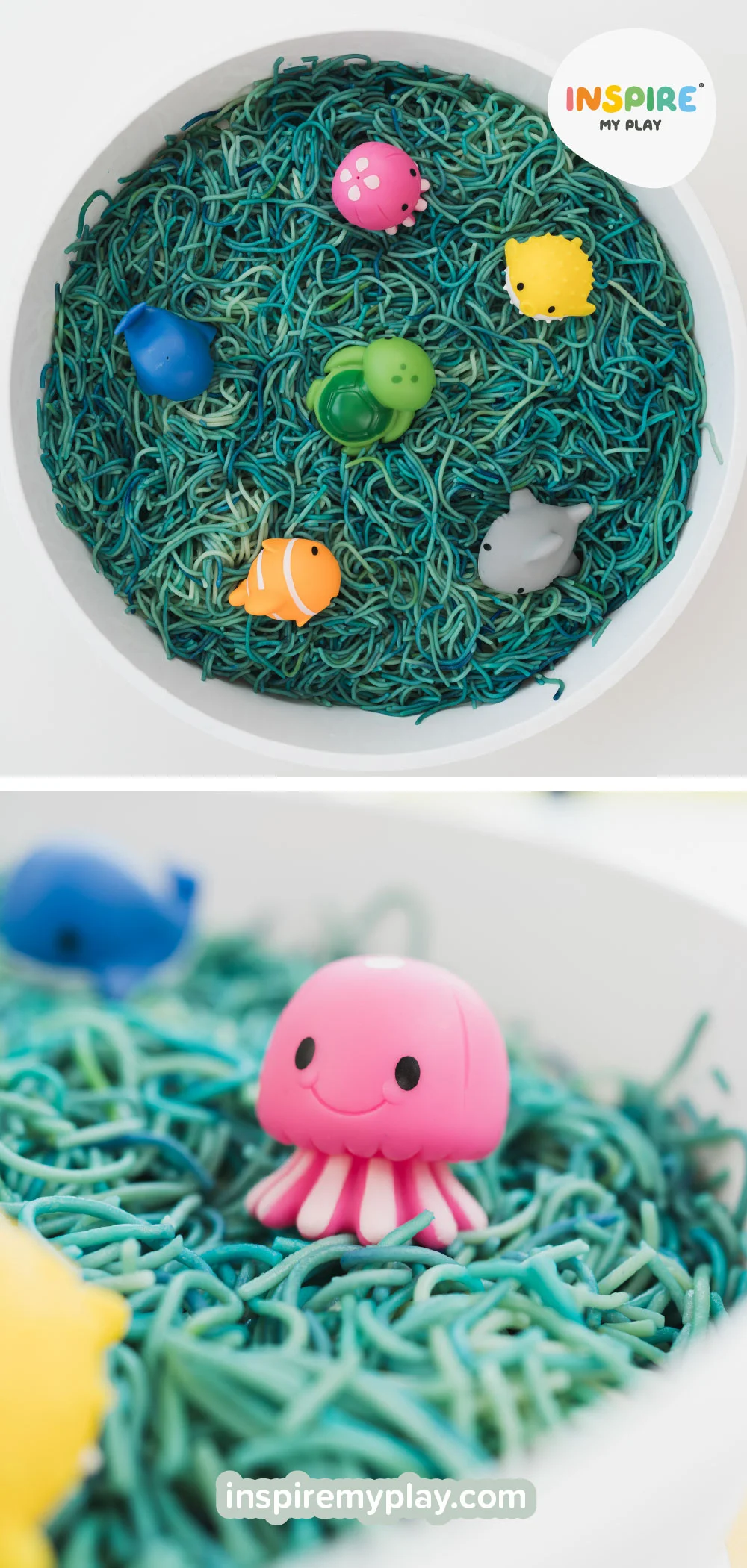Cooked, dyed spaghetti, or leftover cooked pasta makes a fun noodle base for small-world scenes, like spaghetti oceans or underwater seaweed!   To colour spaghetti, simply cook the spaghetti as usual and add a few drops of food colouring. Use tongs to toss the spaghetti in the food colouring and then remove any excess by rinsing the spaghetti.