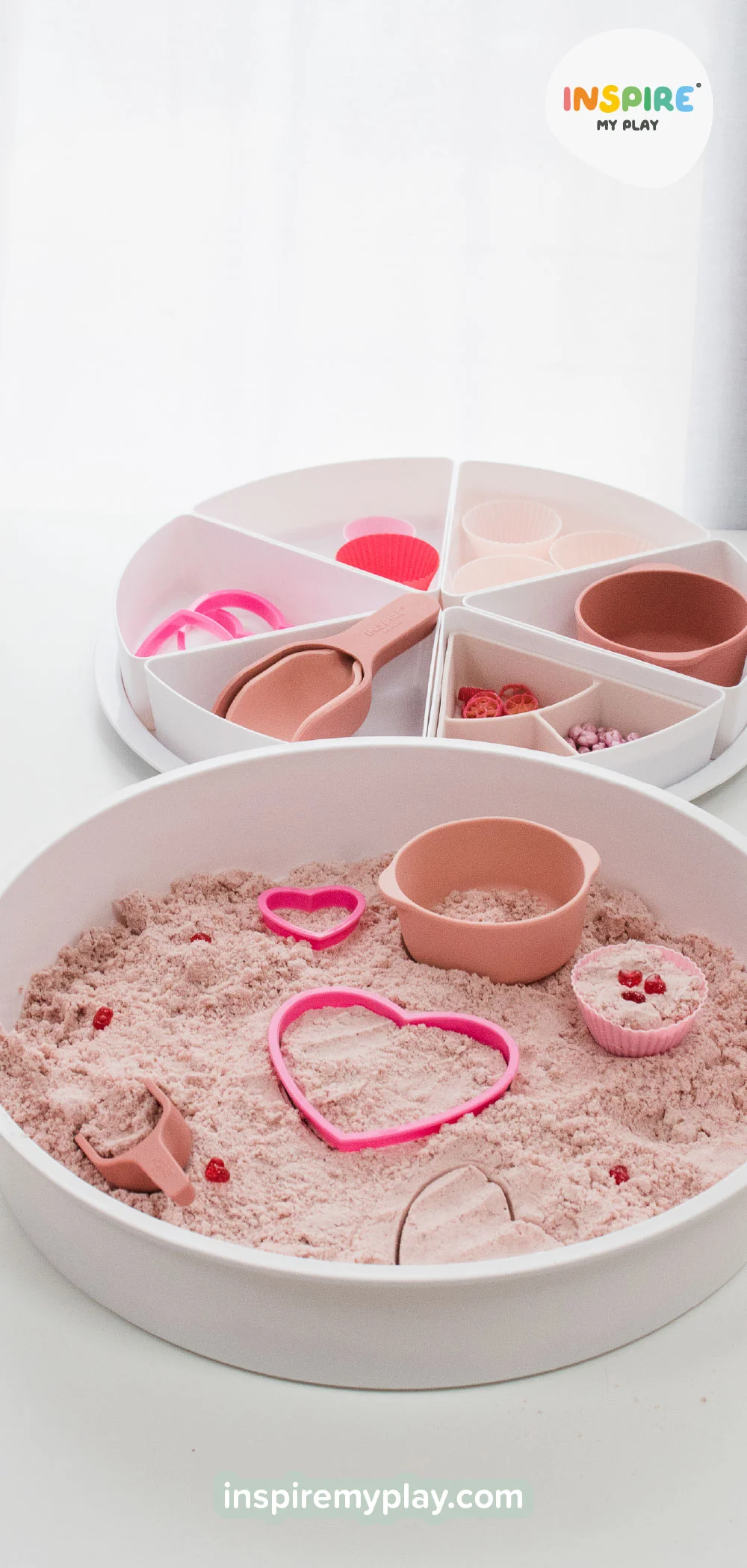 Once cooled, mix the flour with beetroot powder and oil in your tray. Use your fingers to rub everything together until it forms soft, mouldable cloud dough. Use cake cases, cookie cutters, loose parts (we used plastic hearts) and Inspire My Play tools for endless creative fun.