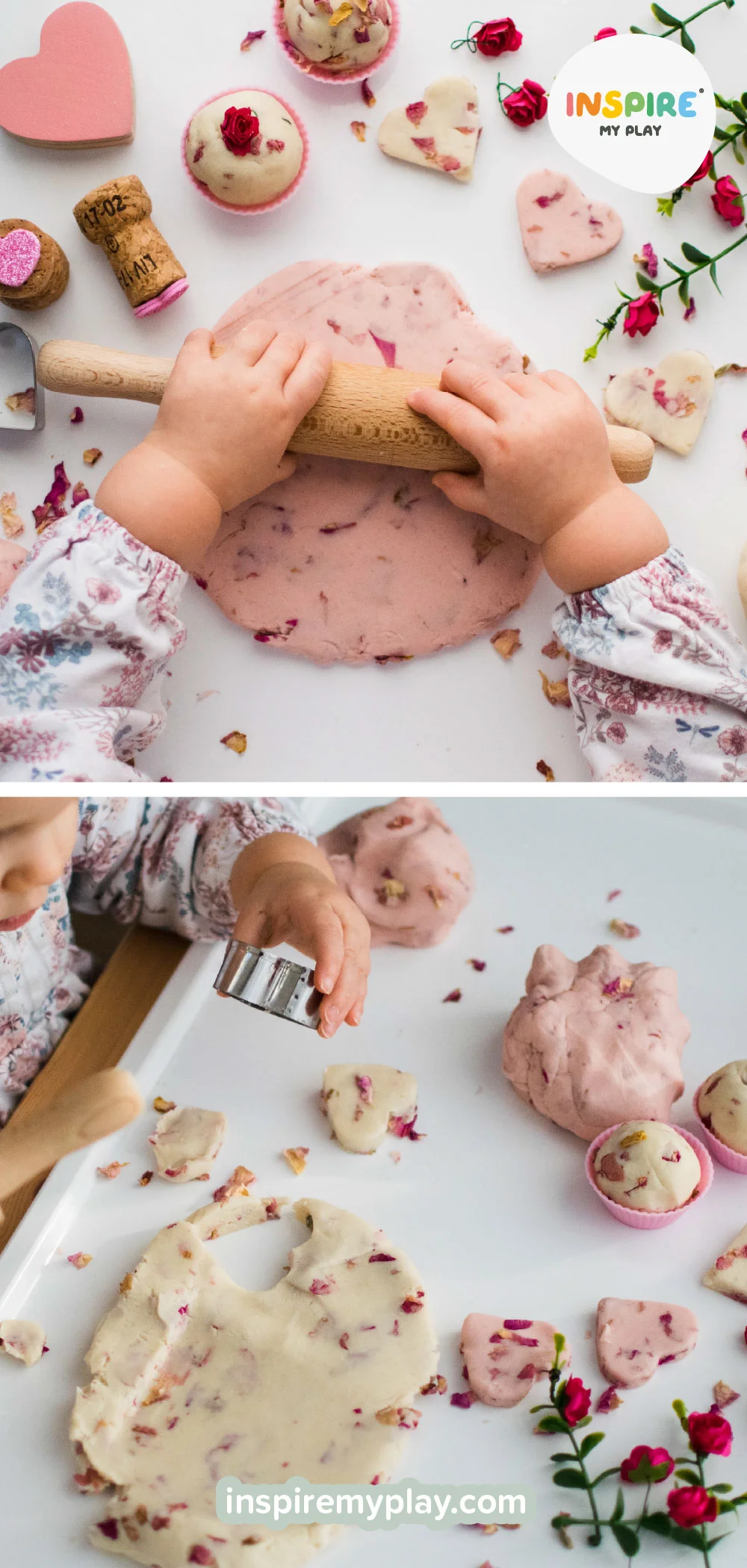We paired our dough with cookie cutters, silicone cupcake cases, and mini roses for a lovely invitation to create or pretend “baking” play.