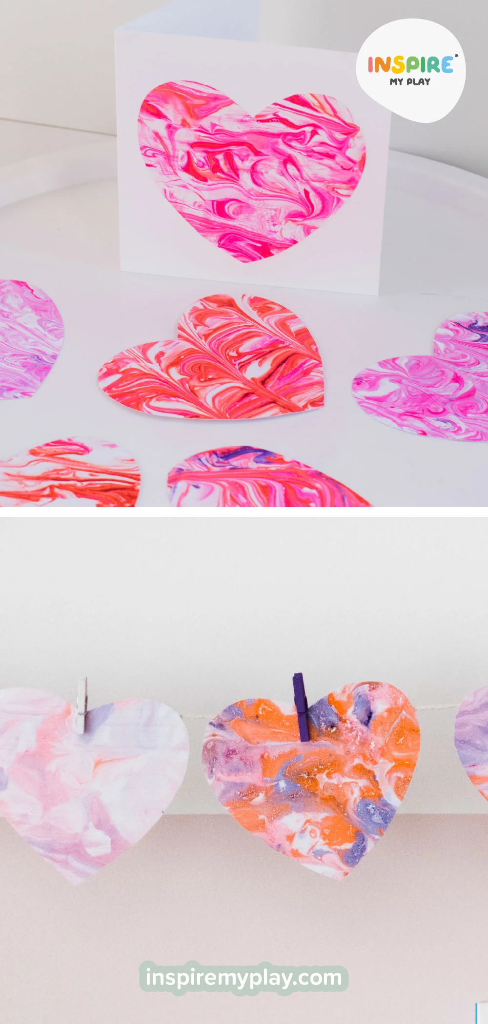 You can repeat the marbling process several times before needing to refresh the colours. We ended up going through multiple trays of shaving foam because the kids were enjoying it so much! Once you’ve scraped off the excess foam, simply cut the card into heart shapes. These make beautiful handmade cards or can be strung together to create a Valentine’s garland.