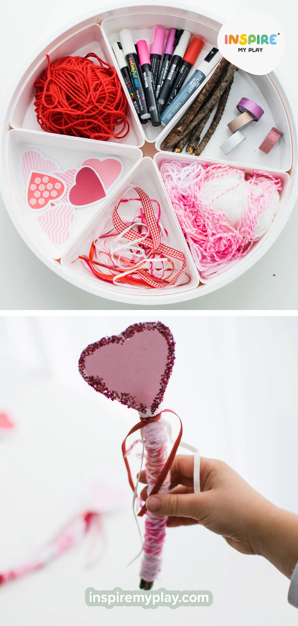 These heart stick wands were such fun to make! We started by collecting sticks on a walk, then set out a selection of materials in the PlayTRAY for the children to decorate them with. Wrapping wool or yarn is a wonderful fine-motor challenge, but younger children can easily paint the sticks or add bio-glitter instead.