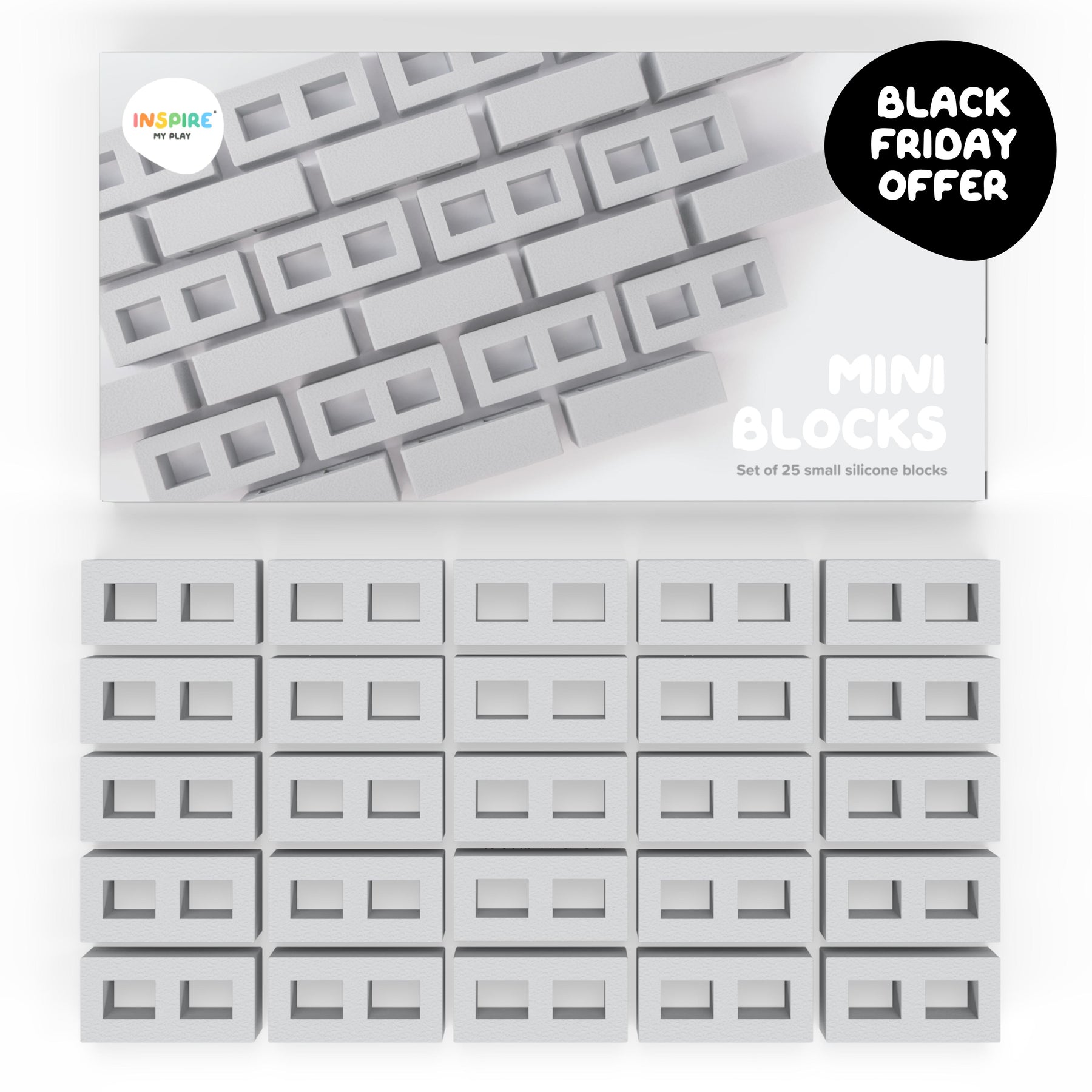 Set includes 25 mini blocks each sized 43mm long x 21mm wide x 19mm high designed to mimic the look of real concrete construction blocks. Suitable for children aged 2 years and up.