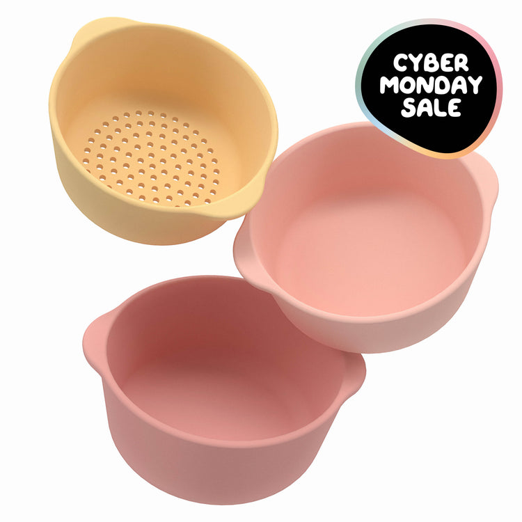 Bowls for Sensory Play. Set of 3 silicone nesting bowls, including 1 sieve