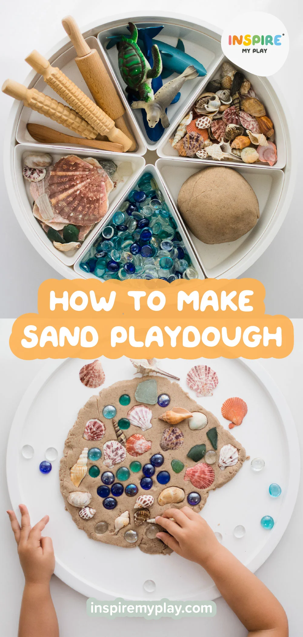 For a fun variation on regular playdough, try making sand playdough! It can be whipped up in 5 minutes by adapting our usual no-cook recipe. Simply add shells and other beach treasures for hours of summer fun and exploration!