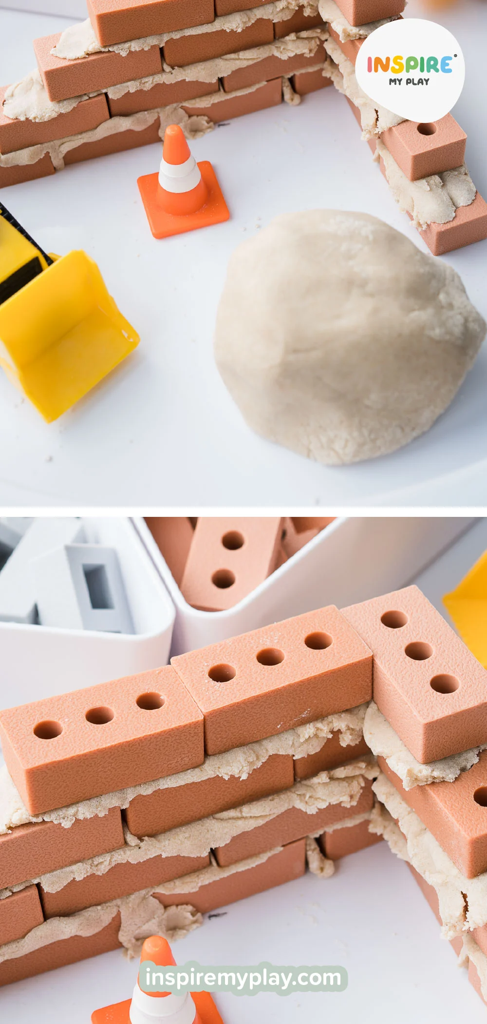 Sand play dough is such a brilliant sensory base for little builders! It’s wonderful texture gives the impression of real building supplies, while still being soft and easy for little hands to mould and shape. The playdough acts a bit like mortar/cement, perfect for pairing with our mini bricks and mini blocks. Press the bricks into the playdough and discover how they stick together, allowing them to build walls, towers, and all sorts of imaginative structures.